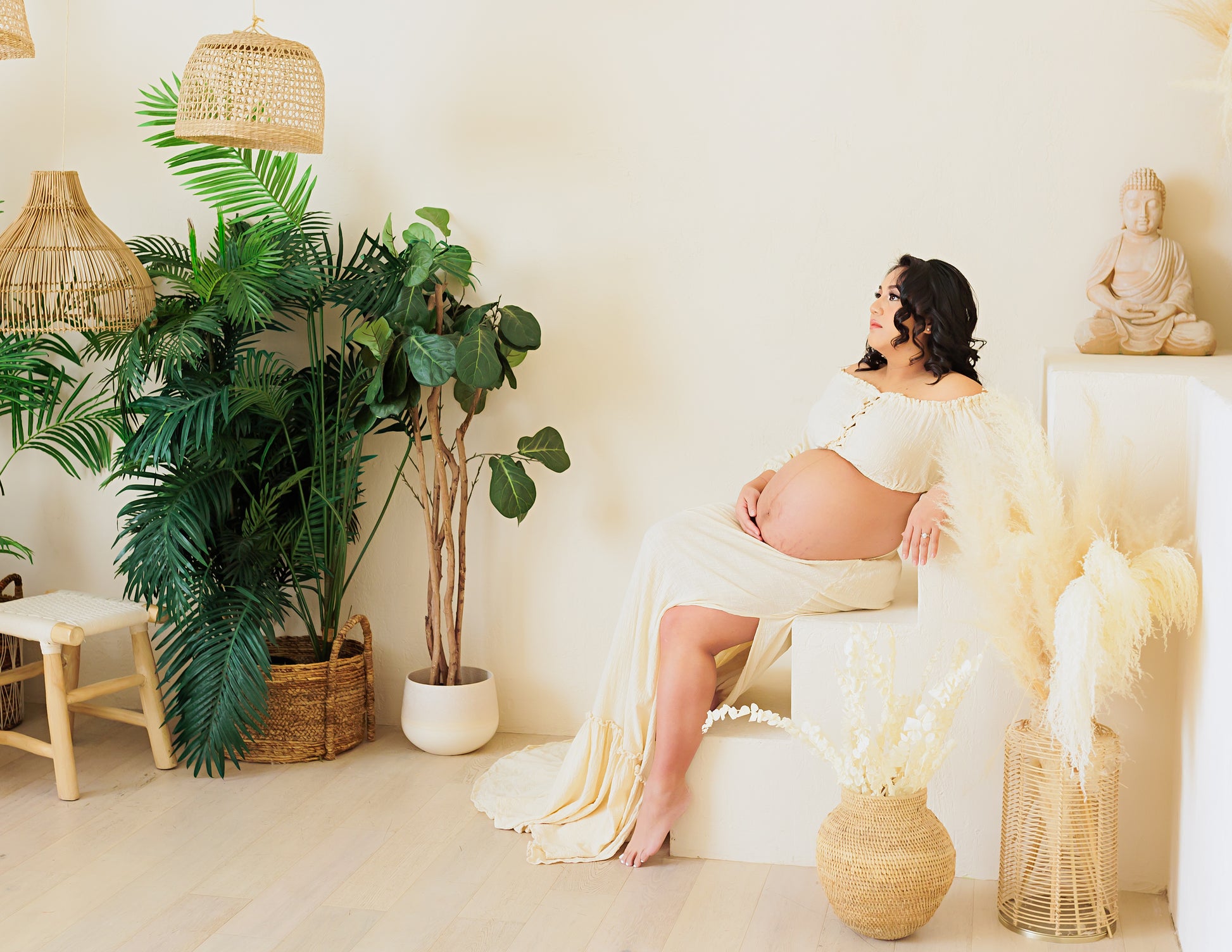 The Alice Gown is a beautiful 2 piece set which is handcrafted and made of cotton. The tube top is long sleeved, has a front tie and features a maxi front split skirt. Show off the baby bump or cover it up. Perfect for both maternity and non maternity photoshoots. Use this for your maternity shoot, mommy and me, engagement, or for portrait shots.